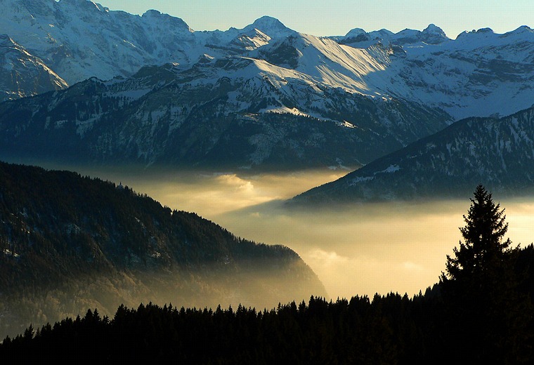 Interlaken unter dem Nebel. Hintergrund Mitte: Lauterbrunner Breithorn.
