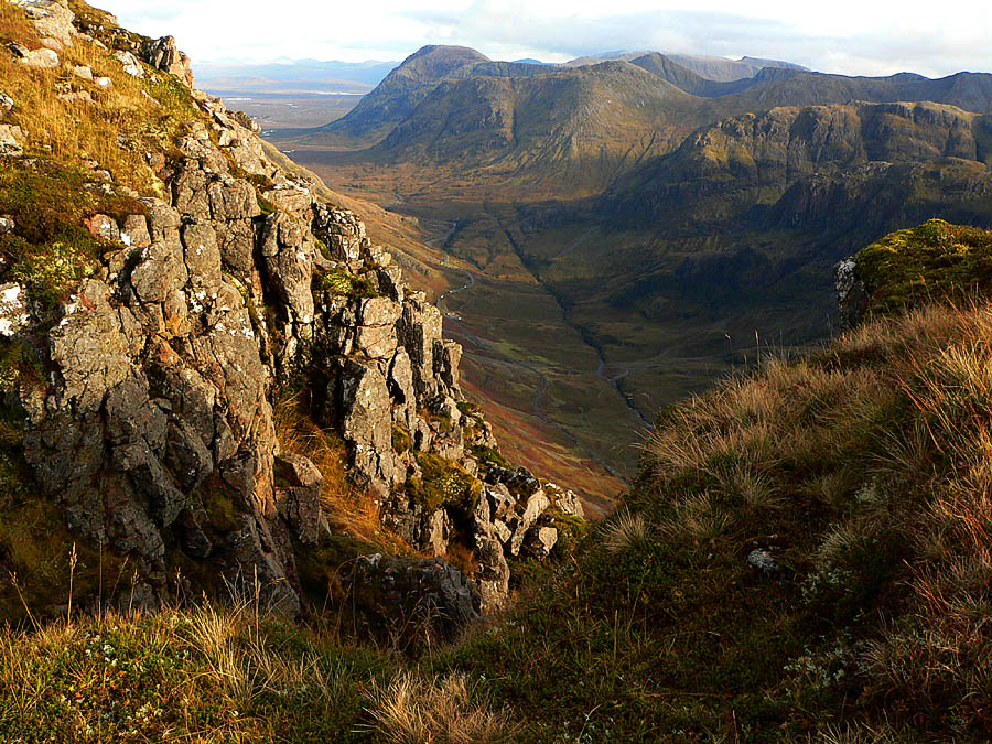 Erst einen Überblick: Buachaille Etive Beag ist die zweithinterste Bergkette mit einer beleuchteten, aber nicht allzu arg verschrundeten Flanke (die verschrundete weiter vorn gehört zu Beinn Fhada) gegen das Tal hin; diese gehört zum Stob Raineach, der hier nicht den Horizont ausmacht, sondern vom Stob Dearg dahinter (Buachaille Etive Mor) überragt wird. Im nächsten Bild steht die Kamera genau in dieser Flanke links unter dem Sattel, Blickrichtung nach rechts, ins Seitental Lairig Eilde hinein.