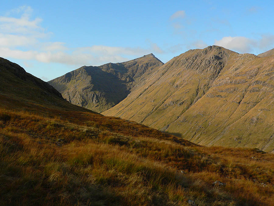 Schon fast aus dem Sattel ist der Talboden des Lairig Eilde aus dem Blick entschwunden, dafür sieht man rechts den Beinn Fhada und links davon Stob Coire Sgreamhach (die Spitze am Horizont) (hierher zurück mit dem Browser).