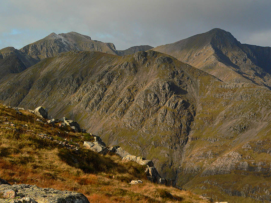 Beinn Fhada im Vordergrund, Stob Coire nan Lochan rechts am Horizont und Bidean nam Bian links am Horizont.