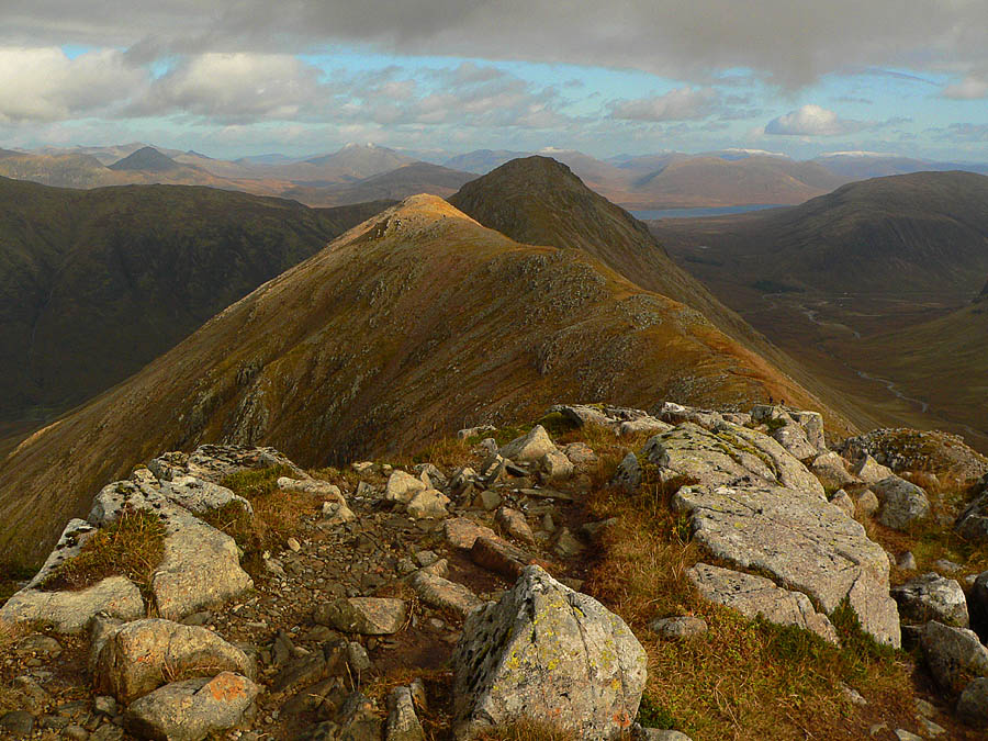 Stob Dubh des Buachaille Etive Beag. Blick nach Nordosten entlang der ganzen Kette des Buachaille Etive Beag. Das Tal rechts ist Lairig Gartain (hierher zurück mit dem Browser).