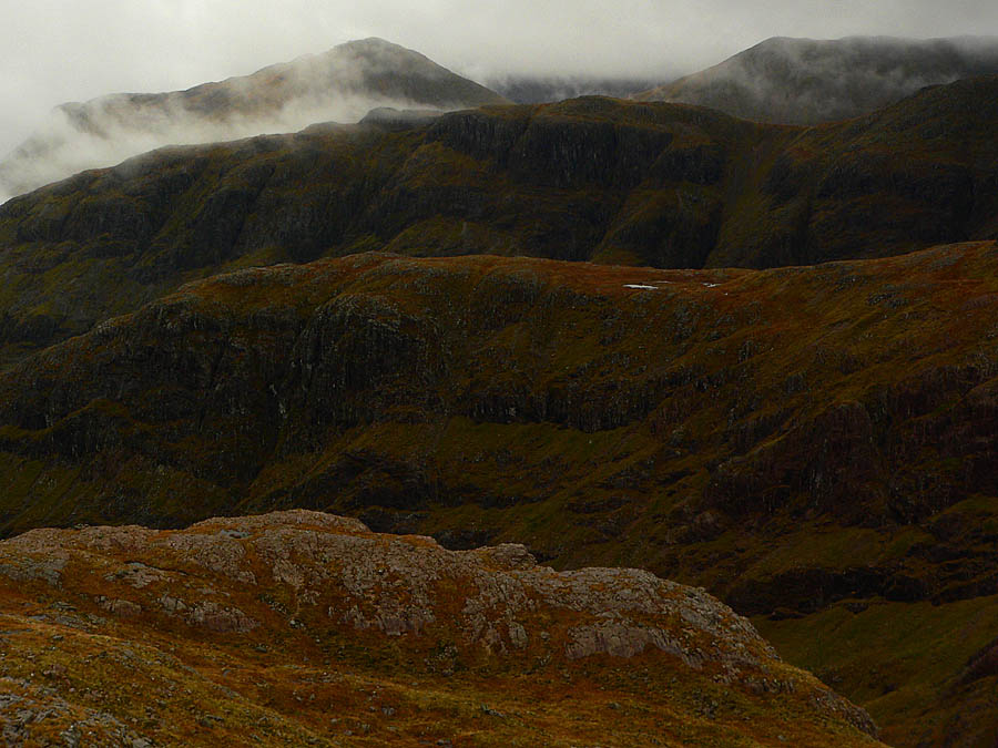 Der Blick nach Osten zeigt die drei Ketten der drei «sisters» (hier eine bekanntere Ansicht auf sie; hierher zurück mit dem Browser): Auf der ersten (Aonach Dubh) steht die Kamera, die benachbarte ist Gearr Aonach (der kurze Aonach), dann Beinn Fhada, der lange Berg (hierher zurück mit dem Browser). Sie alle und auch ganz im Hintergrund einige Gipfel des Buachaille Etive Beag werden uns in dieser Ausstellung noch öfter begegnen.
