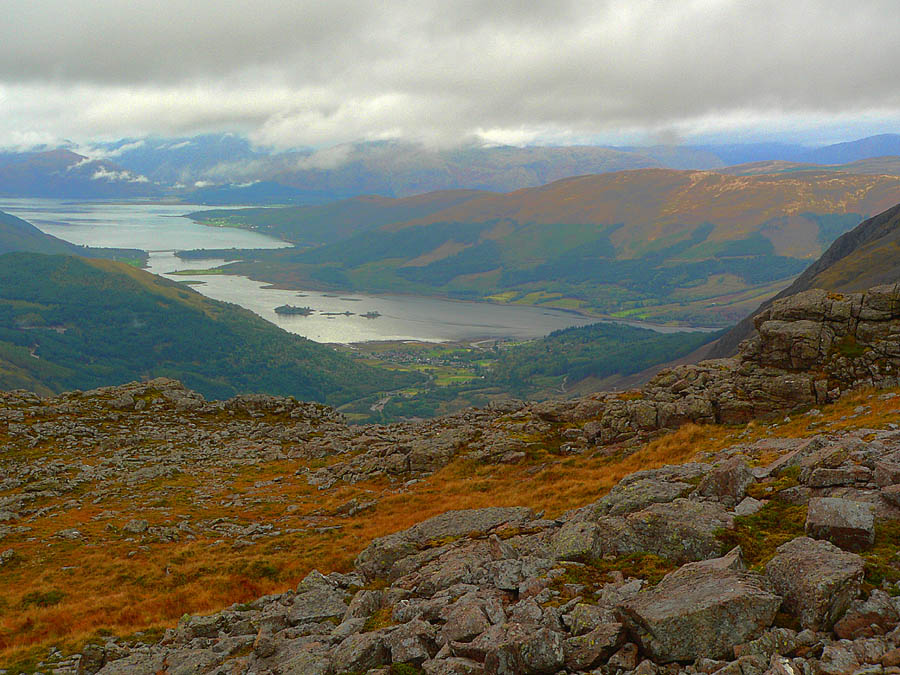 Im Sattel zwischen Stob Coire nan Lochan und Aonach Dubh. Ein Blick auf den Loch Leven, der jenseits der Brücke in den Loch Linnhe übergeht. Das Dorf am Fuß des Bergs ist Baile a Chaolais (die Engländer sagen Ballachulish, und fast so (die Engländer haben einen englischen Akzent :-) spricht man den gälischen Namen auch aus). Die markanten Inselchen wird man in anderen Bildern dieser Serie wiedererkennen, beispielsweise hier. (Blick von weiter nördlich; hierher zurück mit dem Browser).