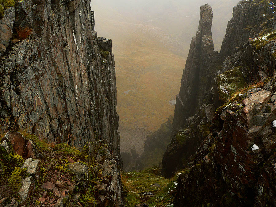 Das markante Couloir über den schwarzen Felsen aus dem vorigen Bild. Unten im Nebel ahnt man die Seelein.