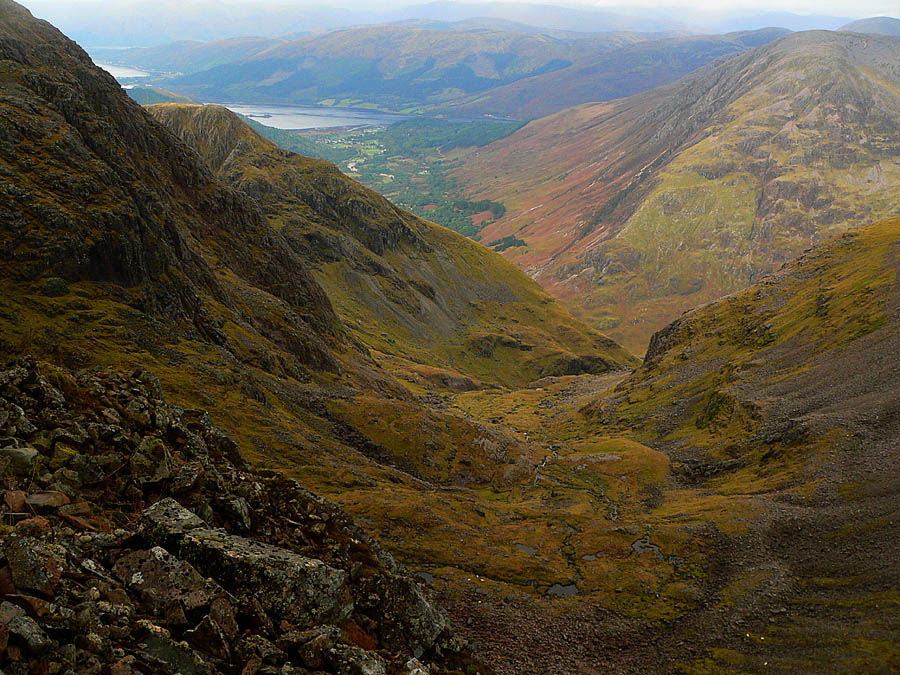 Hier reicht der Blick bis zum Meer (Loch Leven). Hier ein Blick von Gegenüber in das Tälchen zu unseren Füßen (hierher zurück mit dem Browser).