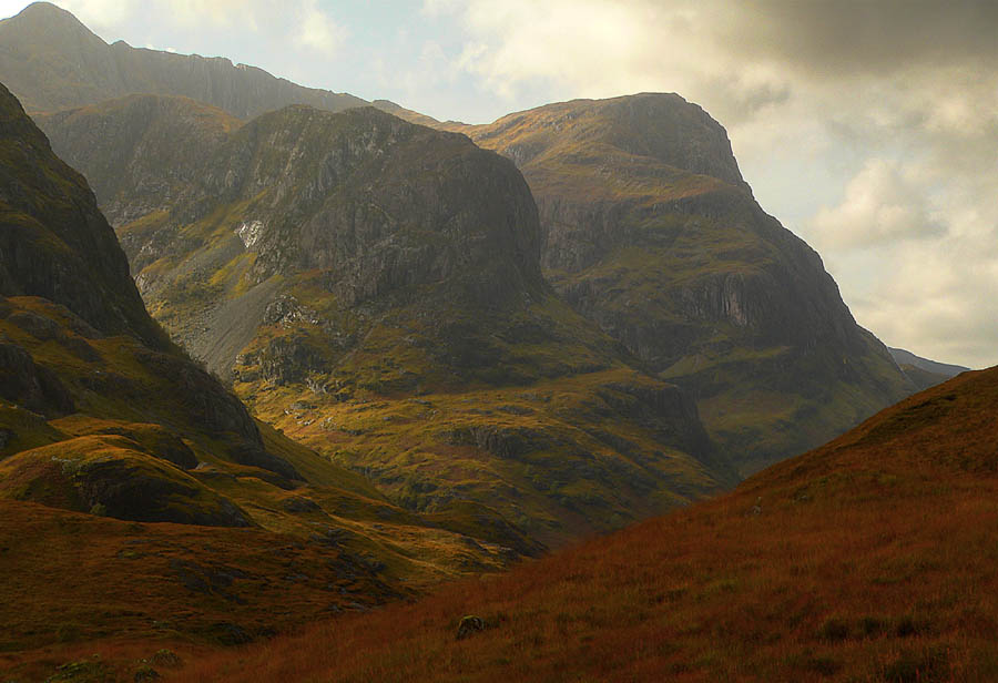 Blick aus dem Gleann Comhann (Glen Coe) nach Westen Richtung Meer (Nord Kanal). Die vom Gletscher abgehobelten Enden der drei Schwestern. Hier sind nur zweieinhalb sichtbar, Beinn Fhada, Gearr Aonach und Aonach Dubh (von links nach rechts).