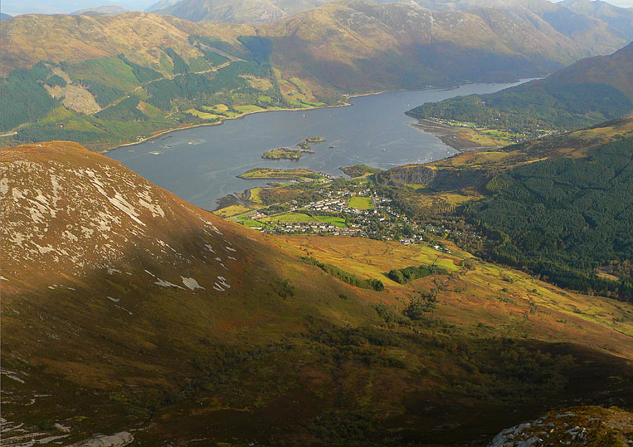 Aufstieg zum Stob Bhan in der Kette des Beinn a Bheithir. Erinnert Ihr Euch an die Inselchen?. Da sah man sie von einem Standpunkt bei etwa 14 Uhr. (Hierher zurück mit dem Browser). Das nähere Dörfchen ist Baile a Chaolais (Ballachulish), das entferntere Glen Coe.