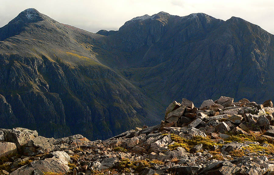 ... und ein näherer Blick auf Bidean nam Bian und das Tälchen davor, das man schon von oben aus dem Sattel (hierher zurück mit dem Browser) gesehen hat. Die Schutthalde gleich unter dem Sattel ist hier nochmal von oben (hierher zurück mit dem Browser).