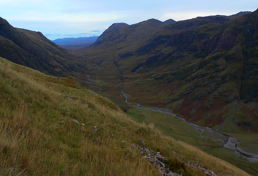 Gleann Comhann in der Abenddämmerung. Der Blick geht nach Osten ins Landesinnere zur Ebene von Rannochmor. Loch Achtriochtan liegt also rechts außerhalb des Bildes.