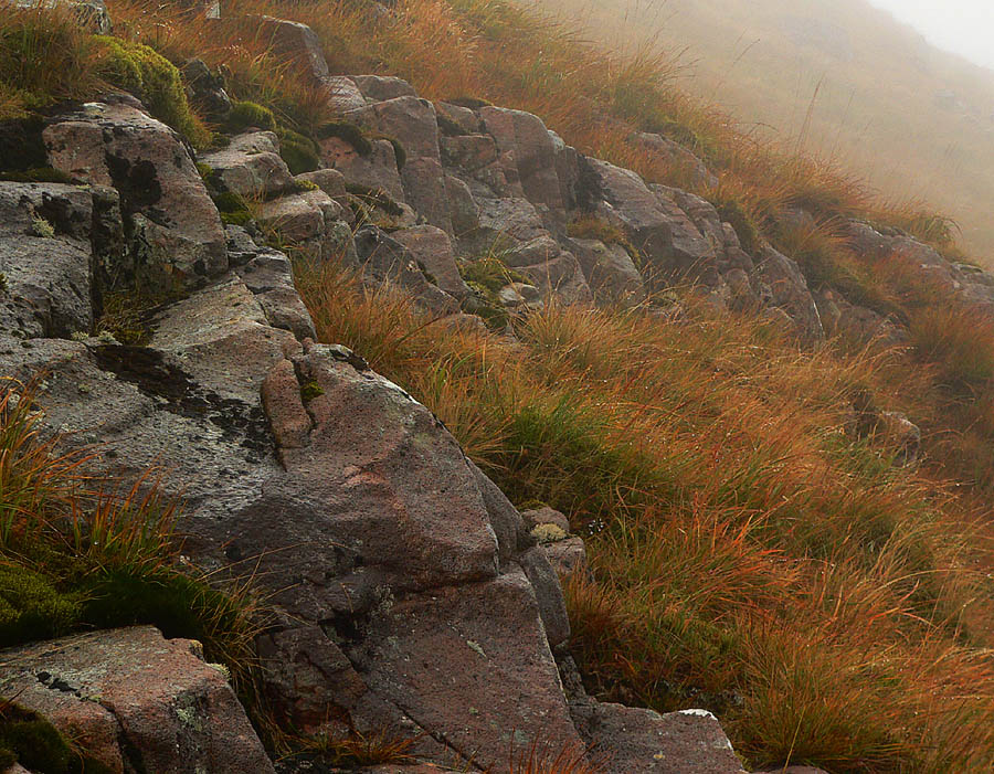 Aufstieg zum Stob Coire Sgreamhach. Wie oft im Nebel. Bezogen auf das erste Bild dieser Reihe (hierher zurück mit dem Browser) erfolgt der Aufstieg von links.