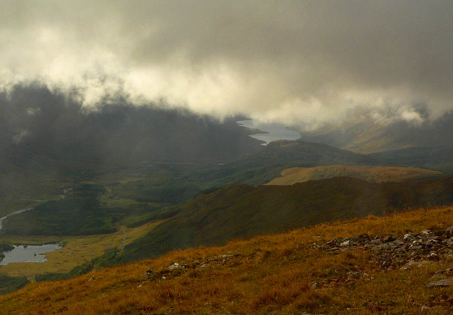 Lochan Urr (links) im Glen Etive, Loch Etive (mitte) und schottisches Herbstwetter (oben).