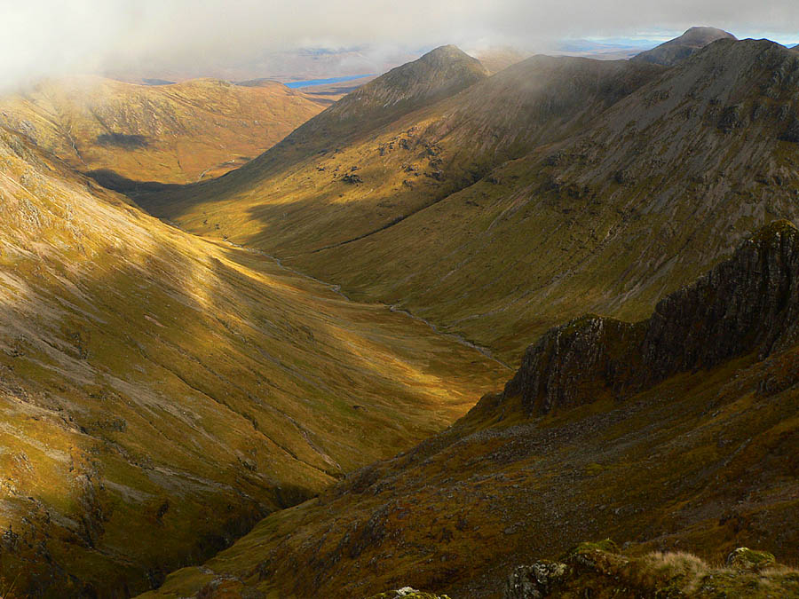 Lairig Eilde, rechts flankiert von Buachaille Etive Beag, rechts am Horizont guckt noch Stob Dearg (Buachaille Etive Mor) hervor. Der Gipfel links Stob Coire Raineach gehört zum Buachaille Etive Beag. Das Tal im Hintergrund ist Glean Comhann.
