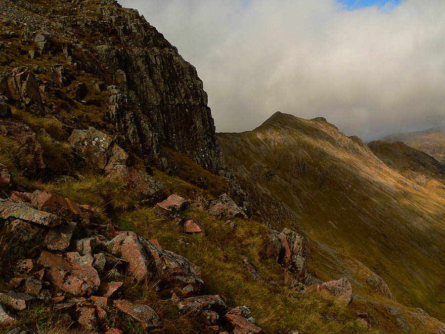 Blick vom Stob Coire Sgreamhach entlang der Bergkette des Beinn Fhada, an deren südseitigen Ende der Stob Coire Sgreamhach steht. Den Kroki findet man hier (Kamerastandort beim Kreuz), eine Gesamtansicht des Beinn Fhada hier und einen Überblick über die Ketten südlich des Glen Coe hier (hierher zurück mit dem Browser).