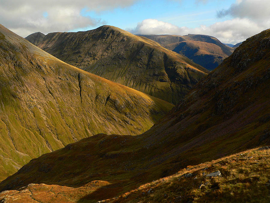 Nochmals die südlichen Ausläufer des Buachaille Etive Beag und des Buachaille Etive Mor mit Stob na Broighe im streifenden Abendlicht. Im Hintergrund Beinn Mhic Chasgaig und am Horizont Clach Leathad.