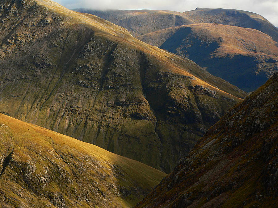 Wie voriges Bild, die südlichen Ausläufer des Buachaille Etive Beag und des Buachaille Etive Mor mit Stob na Broighe im streifenden Abendlicht. Im Hintergrund Beinn Mhic Chasgaig und am Horizont Clach Leathad.