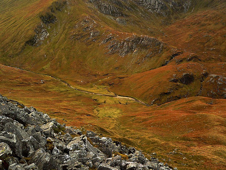 Coire a Mhail. Der völlig unbedeutende Hügel rechts unten hat überraschenderweise doch einen Namen erhalten, Cnoc Reamhar. Er muss irgendwann für irgendwen einmal eine Bedeutung gehabt haben. Oder war es die Boshaftigkeit der besiegten Schotten, die den englischen Eroberern das Gelände zeigen mussten und als Rache irgendwelche Namen ad hoc erfanden? Egal. Jedenfalls enthalten Flurnamen so oder so die Auseinandersetzung von Menschen mit ihrer Landschaft.