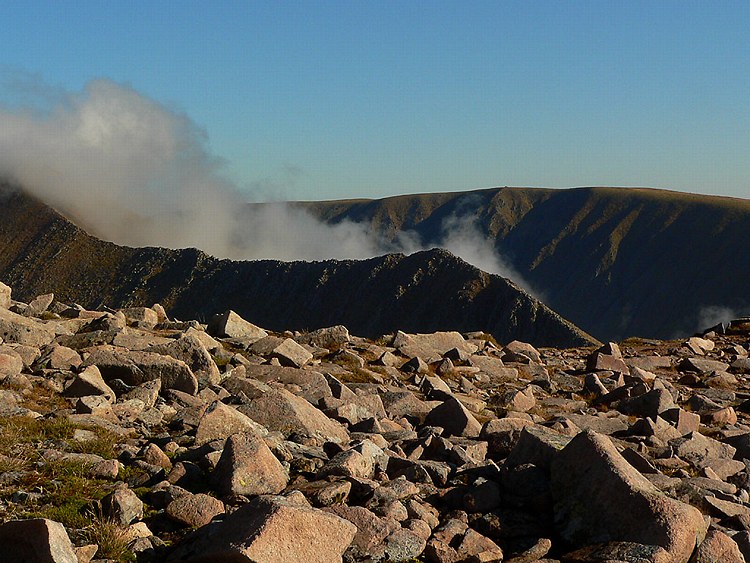 Am Schlusshang zum Ben Nevis, oder am Ende der Carn Mor Dearg Arete (nächster Kamm). Im Hintergrund Aonach Mor.