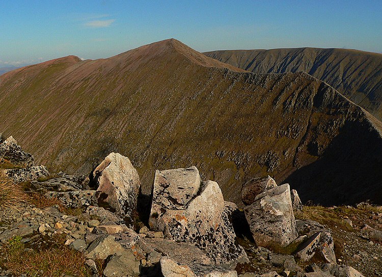 Carn Dearg Meadhonach (links) und Carn Mor Dearg (mitte, diesmal ohne Schleier). Die Schulter ganz rechts ist unbenannt.