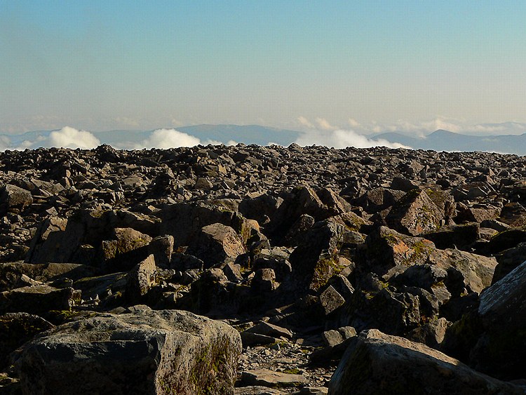 Ben Nevis, das Gipfelplateau. Auf diesen Gipfeln hier kann man sich im Nebel verirren, und offenbar wird diese Gelegenheit auch rege genutzt.