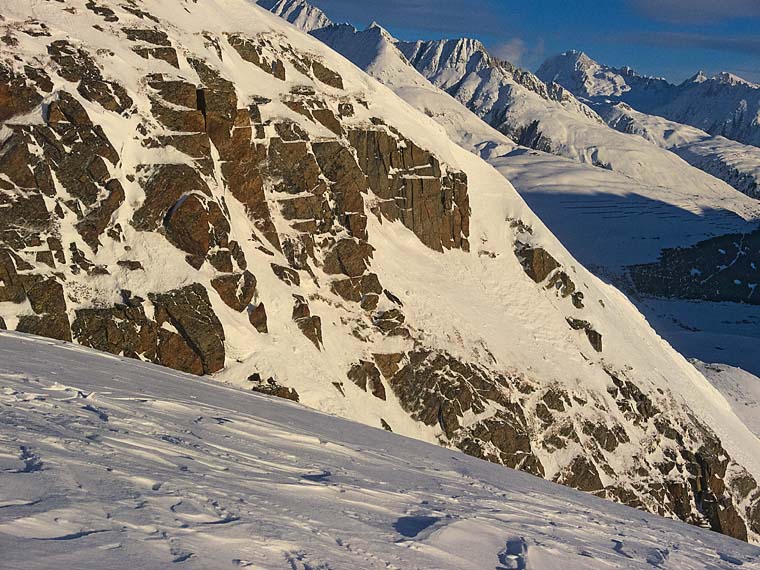 Hinter den Felsen, im Tal links, liegt der Oberalppass.