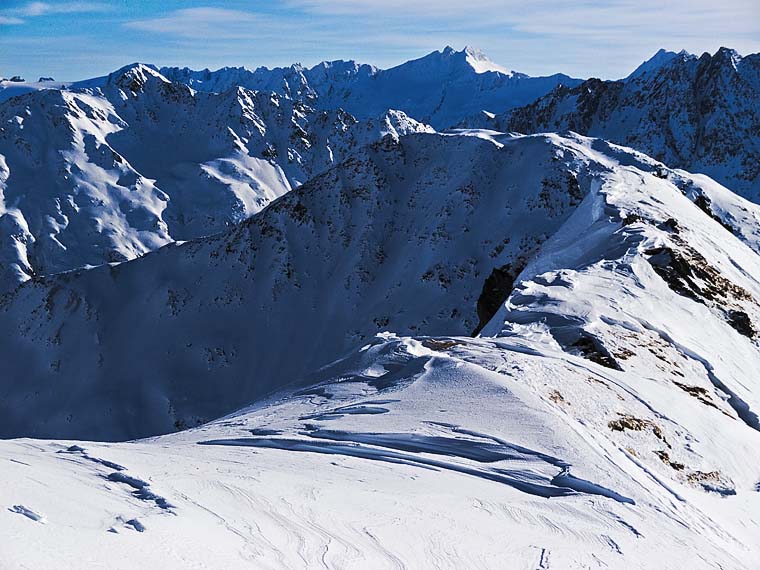 Piz Cavradi mit der blauen Flanke nach links. Darüber am Horizont Piz Gannaretsch (mit den drei Zacken).