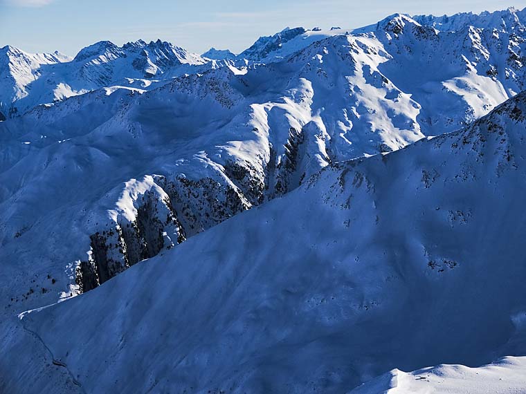 Die blaue Flanke im Vordergrund gehört zum Piz Cavradi.